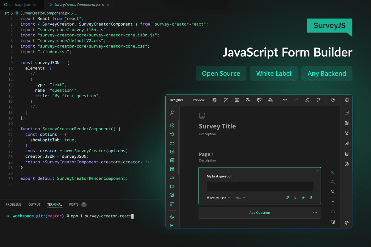 | Stop Reinventing Forms. Use SurveyJS instead. SurveyJS UI libraries allow you build a custom form management platform in any web application. They are extensible and easily integrate into React, Angular, Vue 3, or plain JS apps.